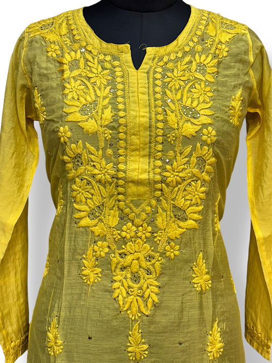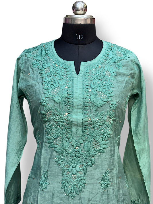 Elegant Chikankari Mul Chanderi Kurti: Crafted with intricate self 3D embroidery...