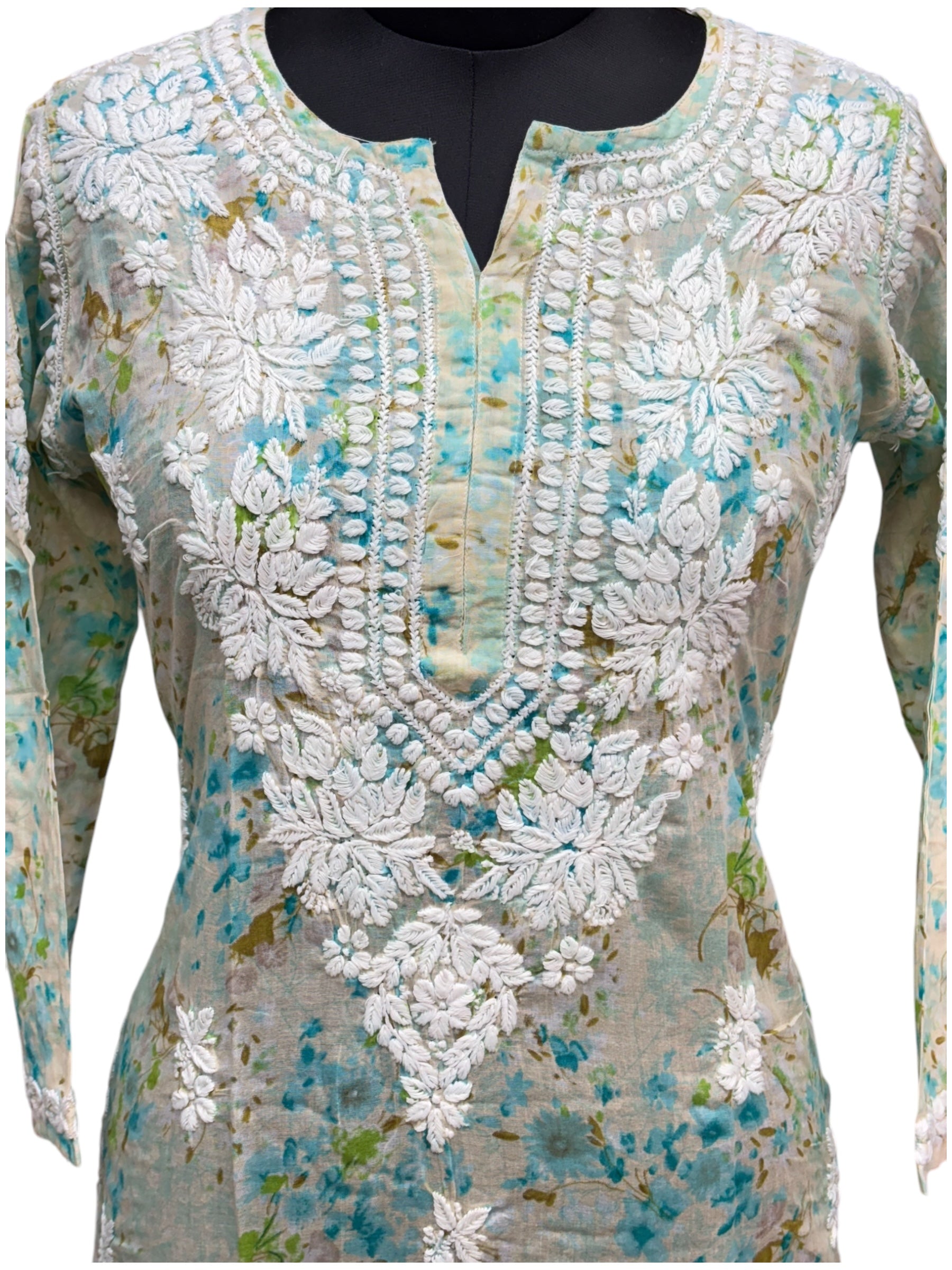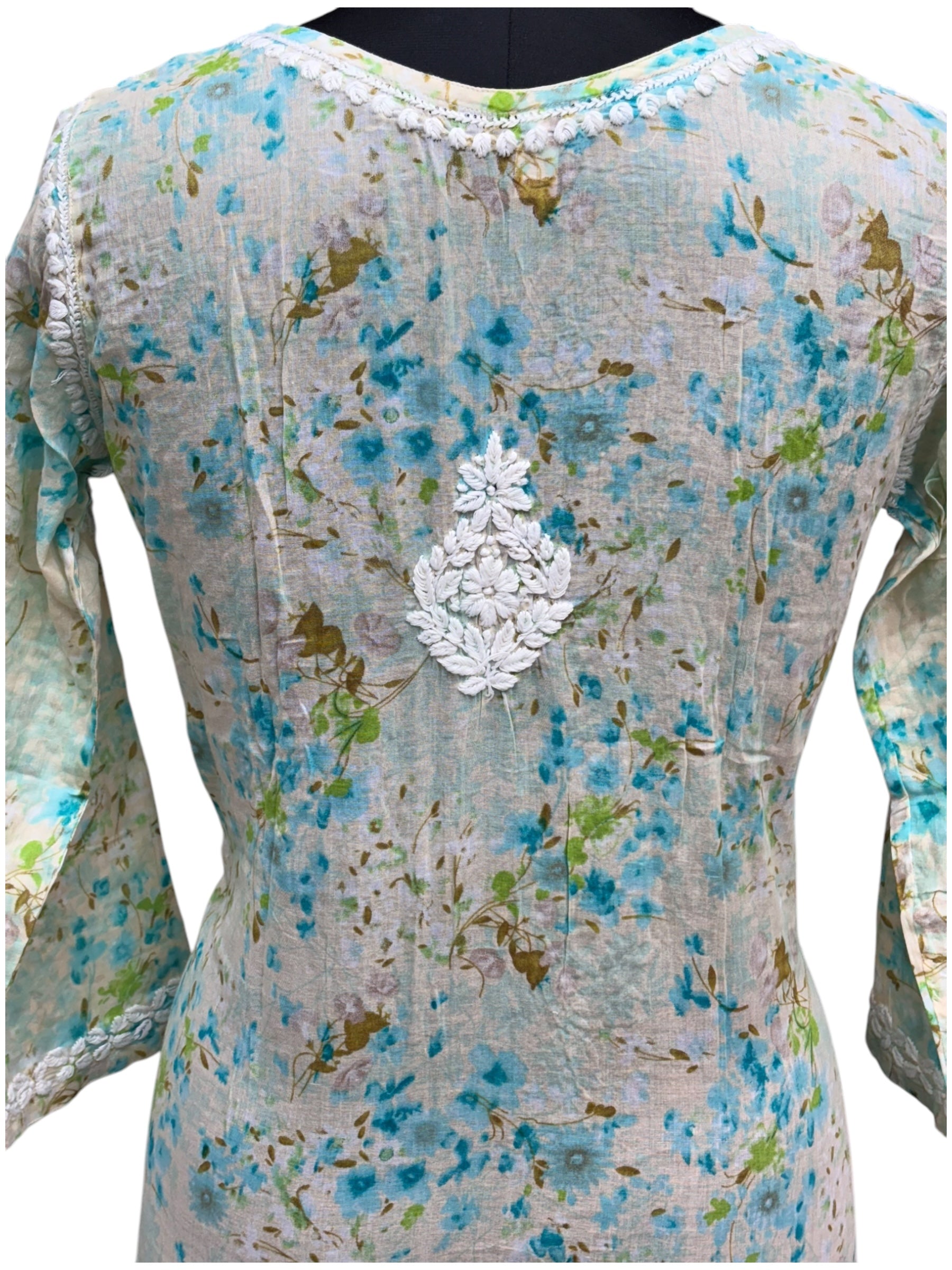 Graceful Printed Mulmul Chikankari Kurti with 3D Floral Embroidery